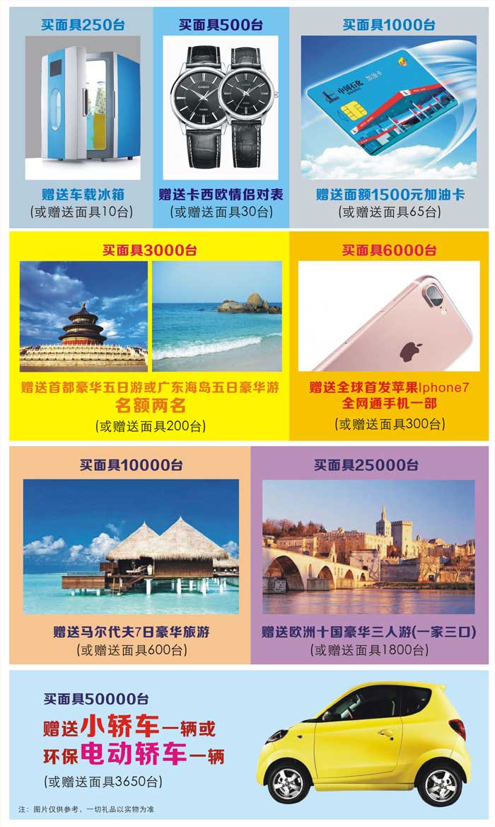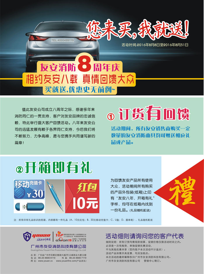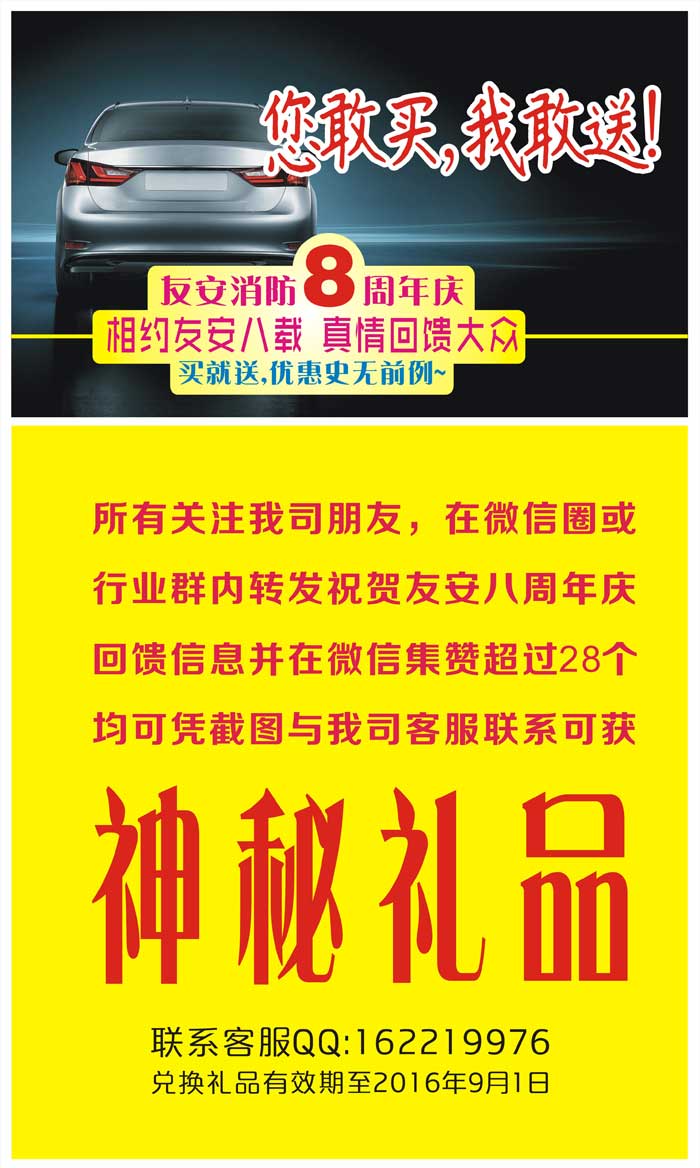 相約友安八載---真情回饋大眾!值此友安公司成立8周年之際,為感謝各界同仁的一貫支持,特此舉辦盛大酬賓活動,“您敢買,我敢送”。活動期間購買友安牌消防面具,送您最新IPhone7手機、馬爾代夫豪華游、歐洲十國豪華游、高級轎車…讓您的這個夏日驚喜連連。另為回饋廣大用戶,活動期間所有產(chǎn)品均“開箱有禮、箱箱有禮”!