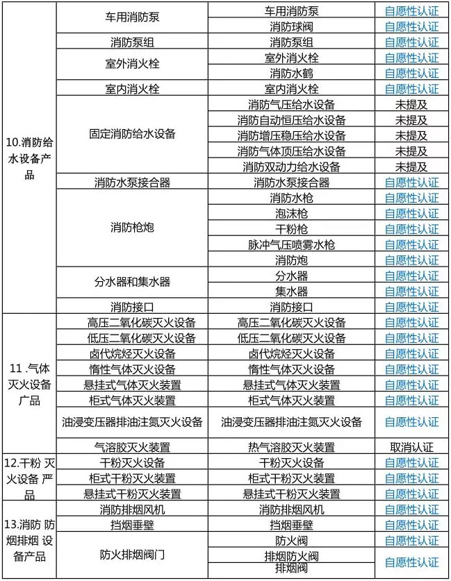 標注為"自愿性認證"的產(chǎn)品為應(yīng)急管理部消防產(chǎn)品合格評定中心發(fā)布的《關(guān)于對十三類消防產(chǎn)品開展自愿性認證工作的通知》應(yīng)急消評〔2019〕21號文件中公布的《十三類消防產(chǎn)品自愿性認證產(chǎn)品目錄》。