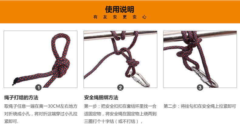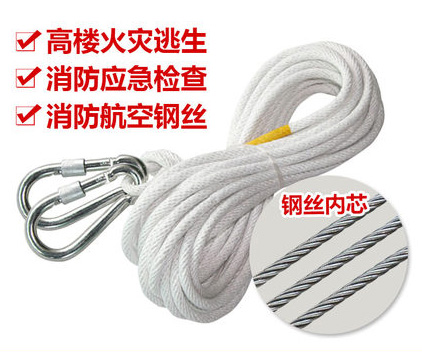 3、繩子阻燃內(nèi)置航空鋼絲。繩子都經(jīng)過(guò)特殊的阻燃處理,內(nèi)置3mm航空鋼絲為安全逃生增加雙重保障。